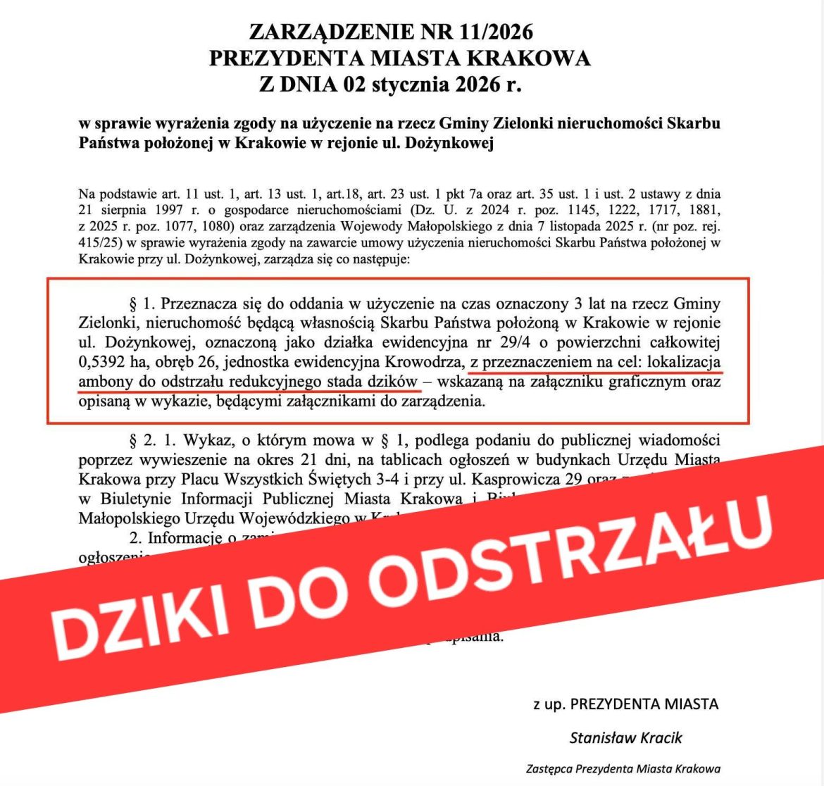 Bo kiedy pobierzesz plik PDF i wczytasz się w treść, okazuje się, czego naprawdę dotyczy to zarządzenie: zgody na postawienie na terenie miasta ambony, z której będą zabijane dziki. I nagle ten niewinnie brzmiący urzędowy tytuł nabiera zupełnie innego znaczenia.